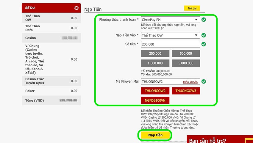 Các bước nạp tiền vào tài khoản Dafabet